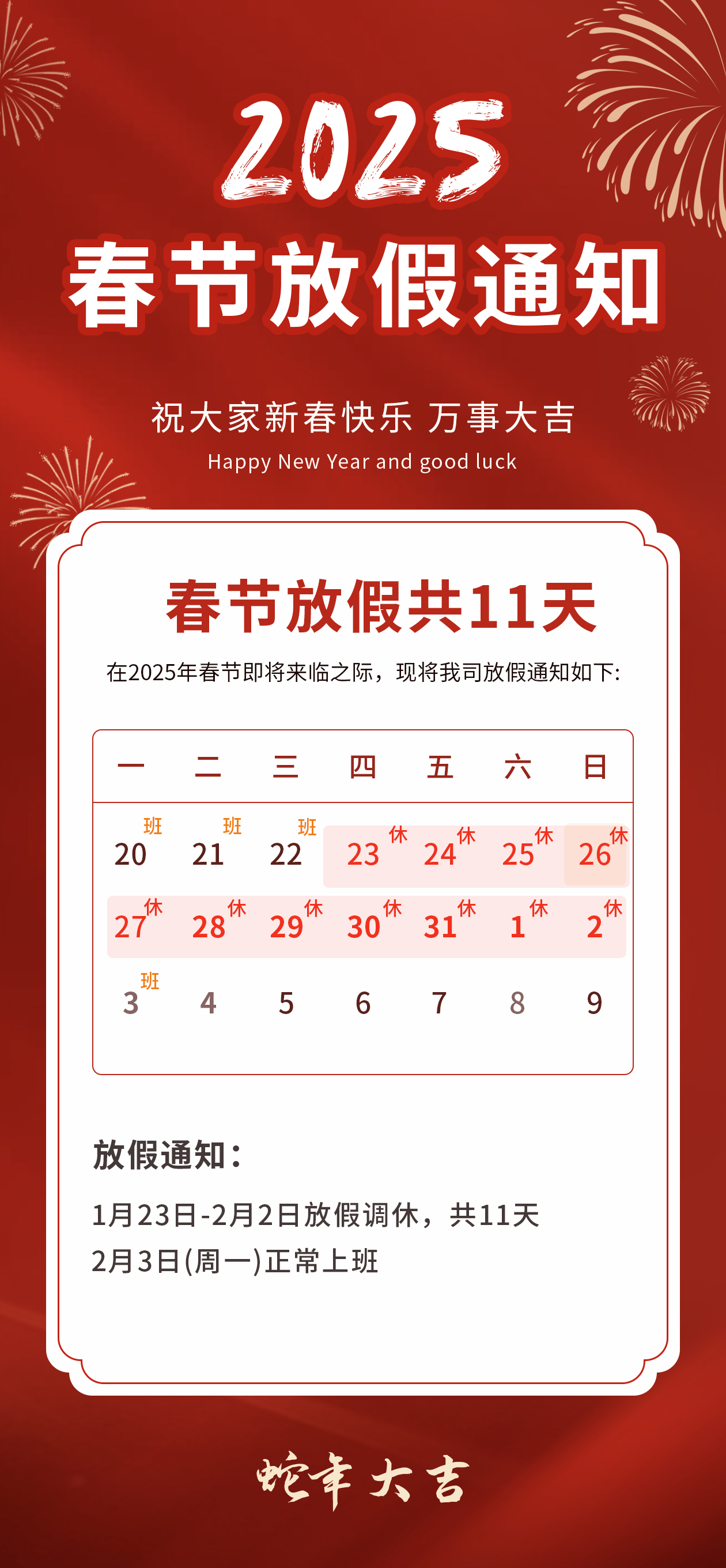 正值中国的传统节日"春节"来临,在此向各位新老客户和广大朋友们拜个早年!预祝大家新春愉快!财源广进!事业红火!为了让公司员工过一个欢乐祥和的春节,将对春节假日提前和延长,现将公司春节放假时间通知如下:2025年1月23日(农历腊月二十四)~2025年2月2日(农历正月初五)(共计11天),2月3日(农历正月初六)正式上班。